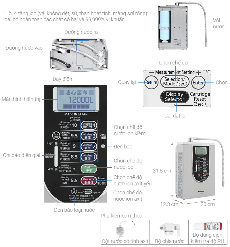 Tiện ích: Có vòi nước axit rời, Giàu Hydrogen chống oxy hóa, Tự động về chế độ nước kiềm sau khi lấy nước axit